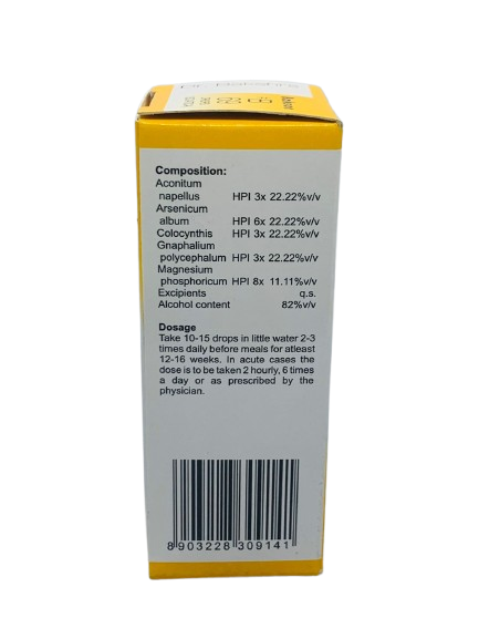 Colocynthis; Magnesia phosphorica; Gnaphalium; Rhus toxicodendron; Arsenicum album