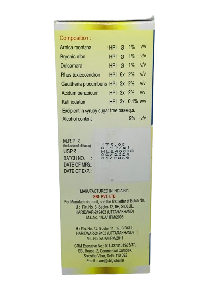 Homeopathic actives as per brand label (e.g., Rhus tox, Bryonia, etc.)
